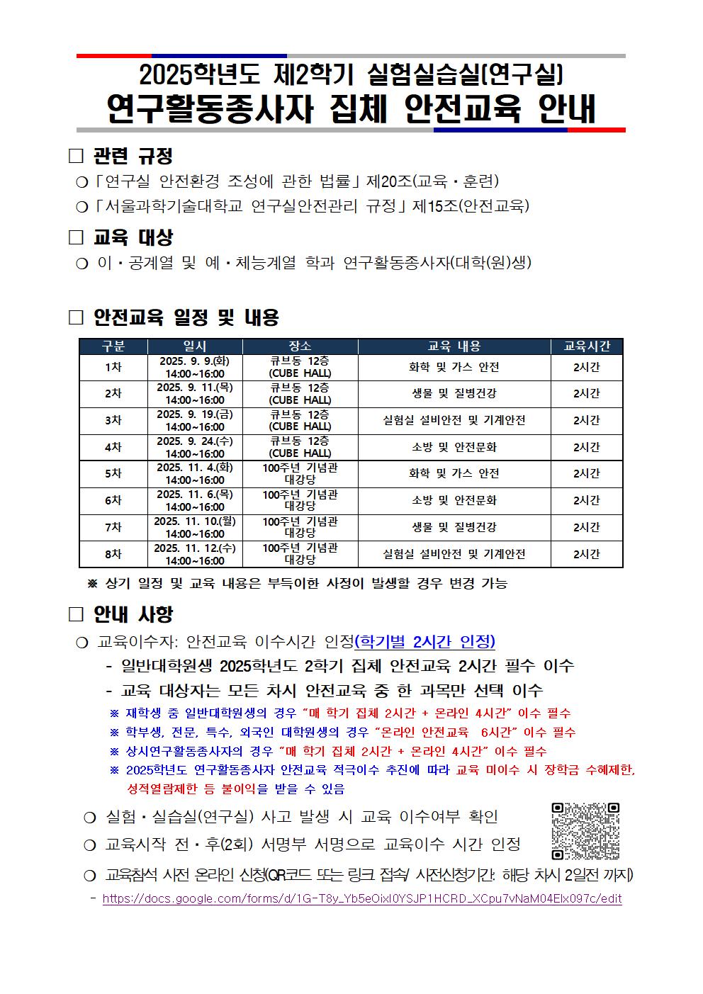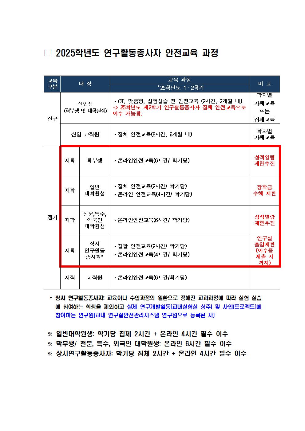 “25학년도 제2학기 연구활동종사자 집체 안전교육을 아래와 같이 안내드리오니, 교육 일정을 확인하시고 반드시 필수교육을 이수해주시기 바랍니다.” 안전교육 미이수시 - 성적열람 제한 - 장학금 수혜 제한 - 연구실 출입 제한
