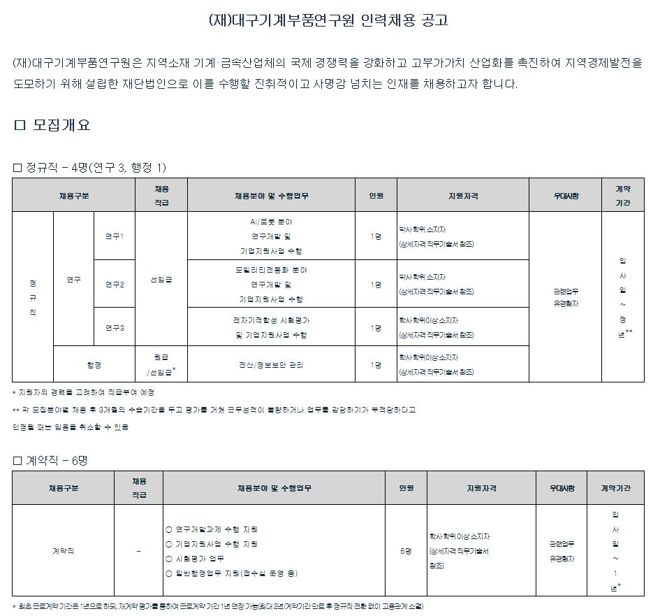 [(재)대구기계부품연구원] 1. 모집부문: 연구/행정/전산/정보보안 2. 근무지: 대구 달서구, 대구 달성군 3. 기업홈페이지: 대구기계부품연구원 4. 공고 URL: (재)대구기계부품연구원 - (재)대구기계부품연구원 인력채용 공고
