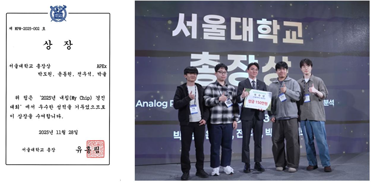 서울과학기술대학교 전기정보공학과 학부 4학년 학생들로 구성된 APEx팀(박도원, 윤동원, 전우석, 박율, 지도교수 심원보)이 지난 11월 28일 개최된 ‘대한전자공학회 2025년도 추계학술대회 My Chip 경진대회’에서 우수상(서울대학교 총장상, 상금 150만원)을 수상하였다.